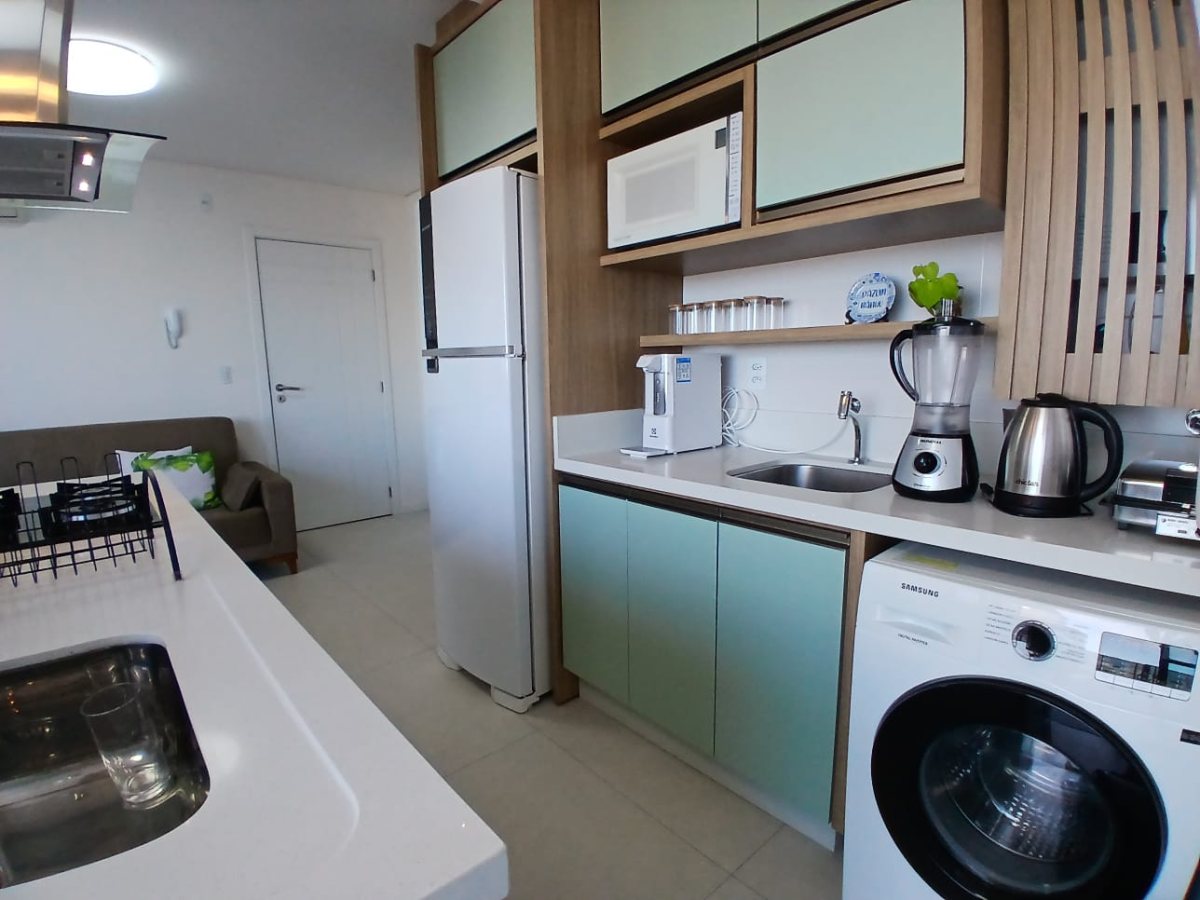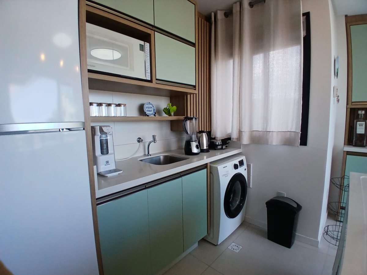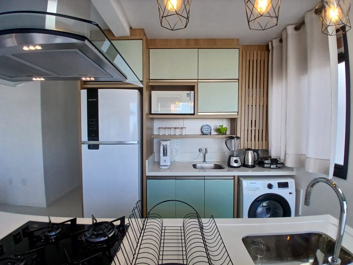Cozinha, sala de estar, sala de jantar integrados;